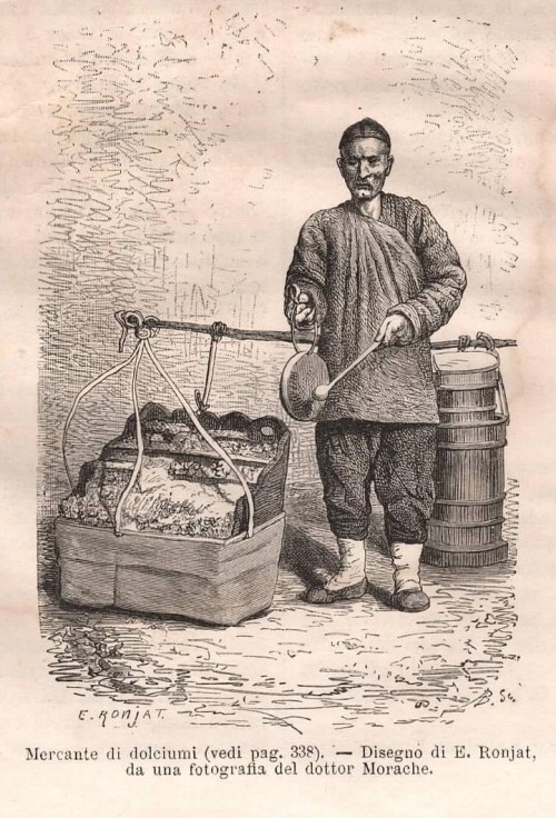 Stampa antica con un venditore di dolciumi ambulante a Pechino (Beijing) in Cina.