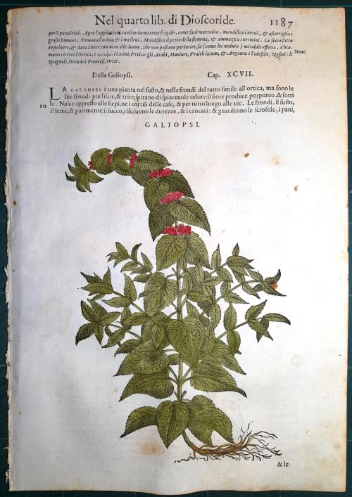 Bel foglio di grande formato dell'antico erbario del Mattioli con una incisione silografica con rami, foglie e fiori di Mirice (Tamarix). |