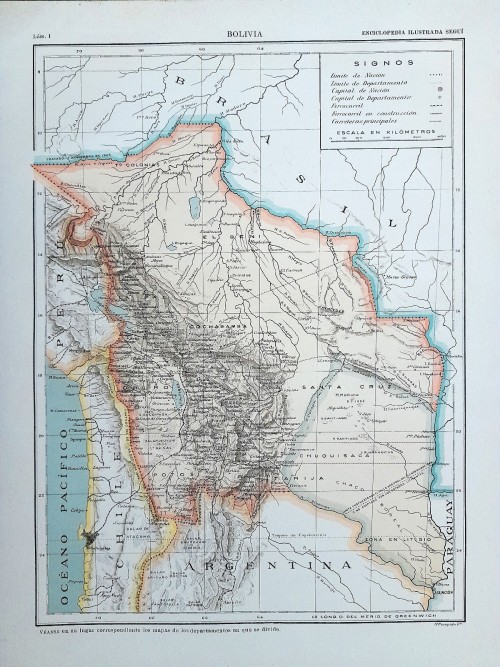 Stampa antica con immagini su entrambi i lati del foglio, da una lato una carta geografica dell' Argentina e sul retro le bandiere, le monete e le uniformi militari sempre dell' Argentina. |