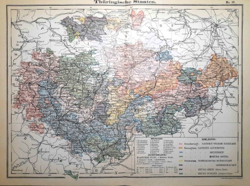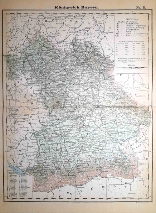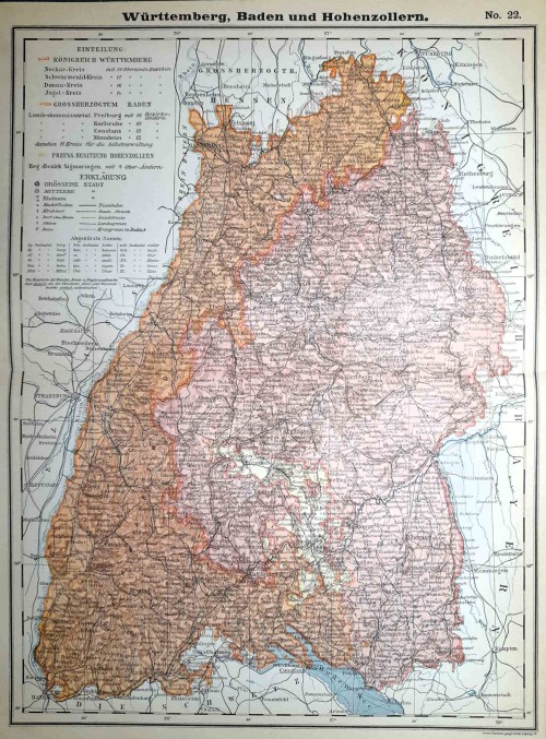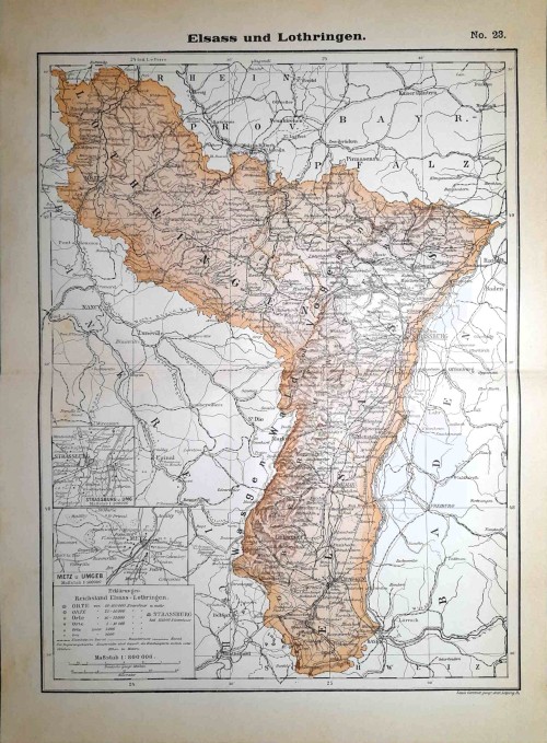 Stampa antica con pianta della città di Magonza (in tedesco Mainz, in francese Mayence), città della Germania occidentale situata alla confluenza dei fiumi Meno e Reno, capoluogo del Land della Renania-Palatinato. Su un lato vi è una lunga legenda con l'indicazione dei luoghi principali della città. |