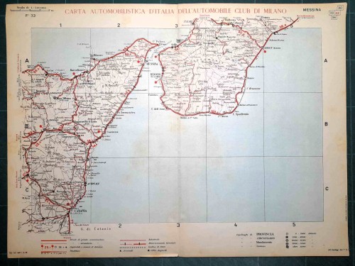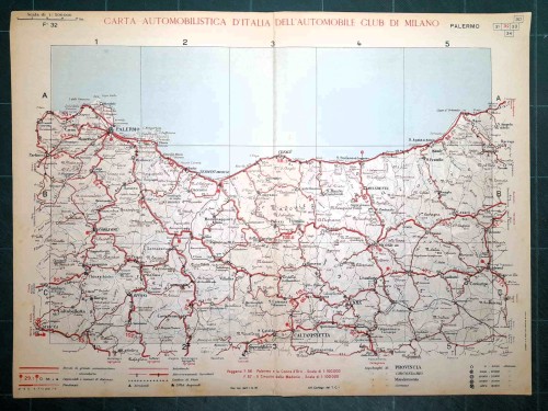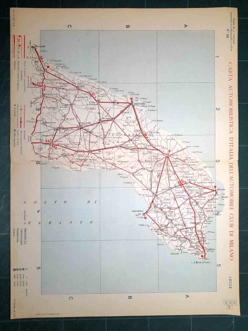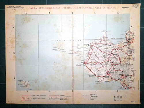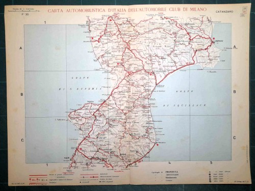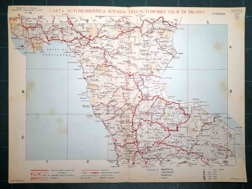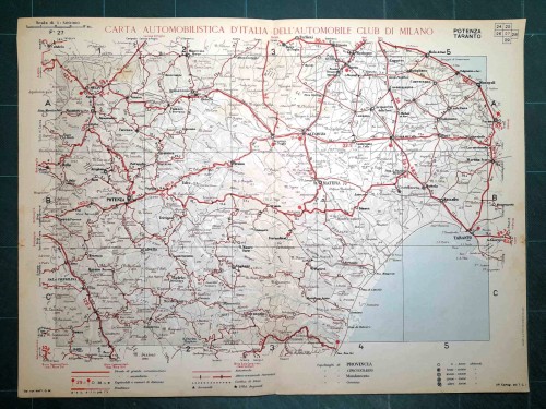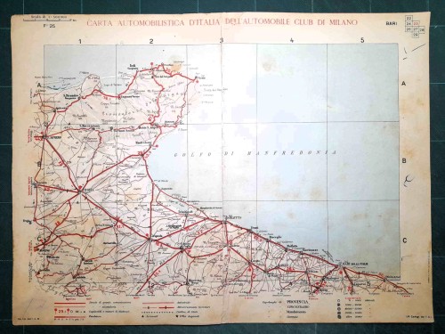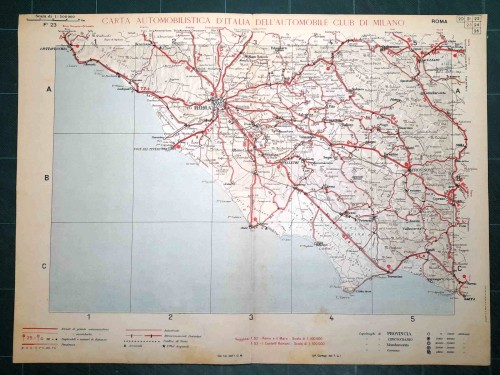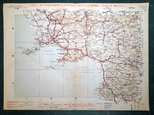 Carta geografica automobilistica antica di Napoli e del territorio circostante, da Caserta e Benevento a nord fino a Vallo della Lucania a sud, con le isole di Capri, Ischia e Procida. Le strade principali dell'epoca sono evidenziate in rosso. Sul retro del foglio vi sono le mappe schematiche di Salerno e Napoli. |