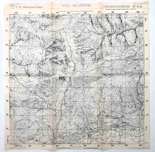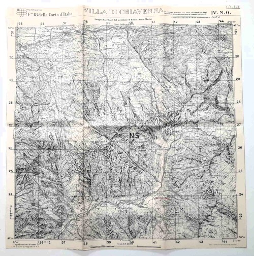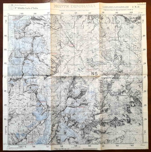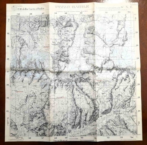 Carta geografica antica del massiccio montuoso del Pizzo Badile, nei monti della Val Bregaglia al confine fra l'Italia e la Svizzera. La carta comprende il territorio dalla Valle Albigna a nord fino alla Val Masino a sud, dal Pizzo Badile a ovest fino al Passo Cameraccio a est, con al centro la Cima della Bondasca e la Cima Zocca. |
