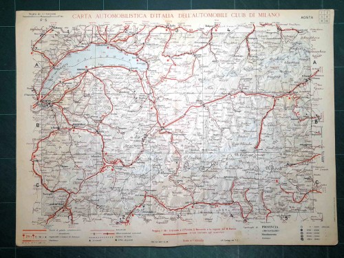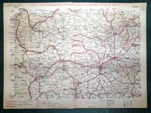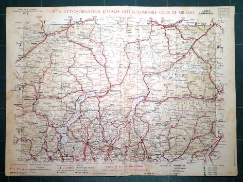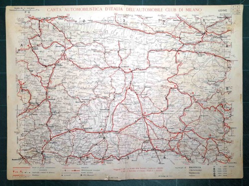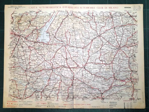 Carta geografica automobilistica antica di Verona e del territorio circostante, da Schio, Thiene e Bassano a nord fino a Guastalla, Mirandola e Ferrara a sud, da Brescia e Casalmaggiore a ovest fino a Padova, Rovigo e Adria a est, con Verona e il lago di Garda al centro del foglio. Le strade principali dell'epoca sono evidenziate in rosso. Sul retro del foglio vi sono le mappe schematiche di Padova e Verona. |