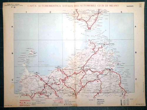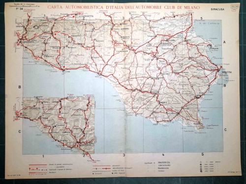 Carta geografica automobilistica antica di Napoli e del territorio circostante, da Caserta e Benevento a nord fino a Vallo della Lucania a sud, con le isole di Capri, Ischia e Procida. Le strade principali dell'epoca sono evidenziate in rosso. Sul retro del foglio vi sono le mappe schematiche di Salerno e Napoli. |