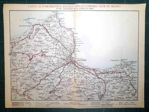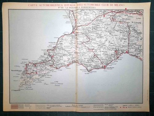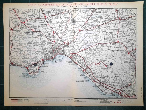 Carta geografica automobilistica antica di Napoli e territorio circostante. Le strade principali dell'epoca sono evidenziate in rosso. Sul retro del foglio vi è una mappa schematica di Caserta.