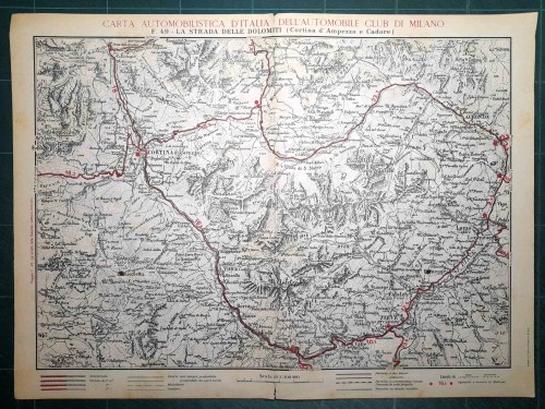 Carta geografica automobilistica antica della strada delle Dolomiti, con Cortina d'Ampezzo e il Cadore. Le strade principali dell'epoca sono evidenziate in rosso.