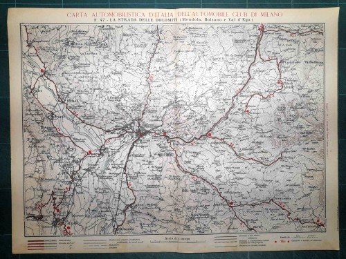 Carta geografica automobilistica antica della strada delle Dolomiti, con Bolzano (Bozen) al centro del foglio. Le strade principali dell'epoca sono evidenziate in rosso.