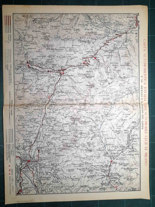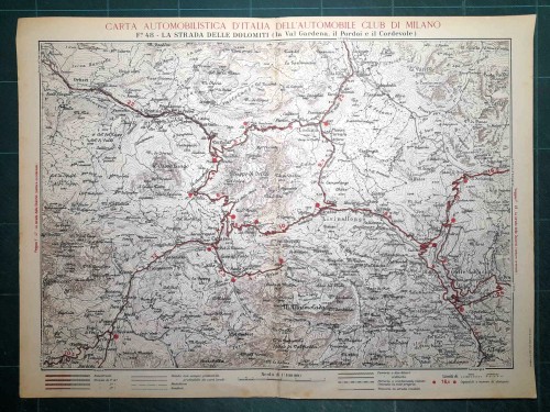 Carta geografica automobilistica antica della strada delle Dolomiti, con la Val Gardena, il Pordoi e il Cordevole. Le strade principali dell'epoca sono evidenziate in rosso.