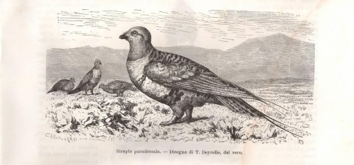 Stampa antica con numerosissimi uccelli acquatici e di terra su entrambi i lati del foglio, anatre, cigni, molti uccelli di palude, fagiani, galli e galline, tacchini ecc. |