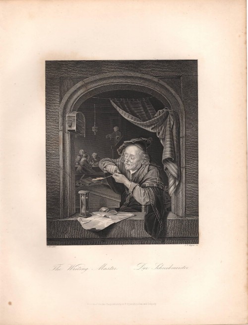 Bella stampa antica tratta da un dipinto di Jan Baptiste Weenix il vecchio con un arrotino affilatore di coltelli e forbici all'opera all'ingresso di un'abitazione signorile. L' immagine è animata dalla presenza di figure, un cane, un gatto, alcune galline ed anatre. |