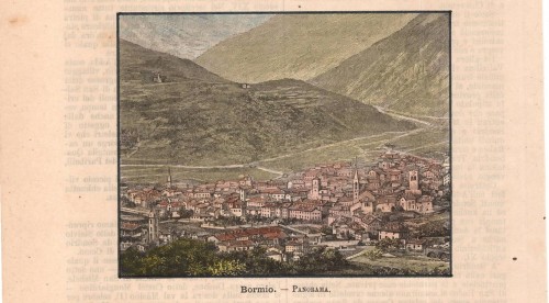 Bella stampa antica con veduta panoramica di Sondrio presa da sud, nei pressi di Albosaggia, con la chiesa parrocchiale sulla destra. Sulla sinistra sono riconoscibili San Lorenzo, sulla cima di un'altura, e la strada della Valmalenco, che si apre sullo sfondo dell'immagine. In primo piano sulla destra non vi è ancora la stazione ferroviaria, inaugurata nel 1885, fatto che spinge a retrodatare di alcuni anni la realizzazione del disegno. |