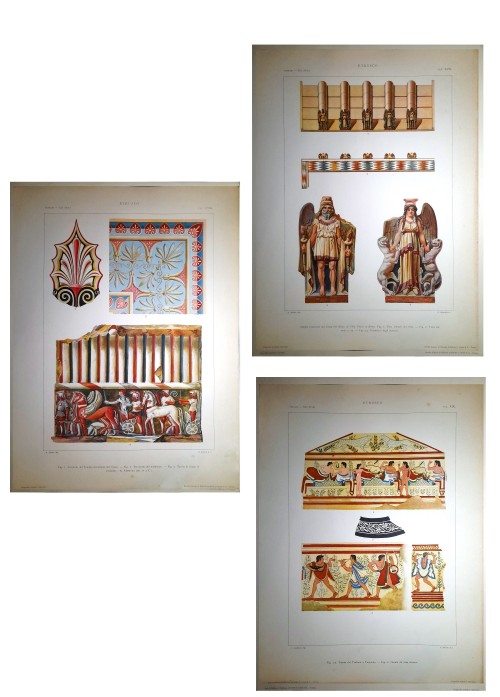 TITOLO CIVILTA' ETRUSCA Serie di 3 stampe antiche con monumenti e decorazioni policrome