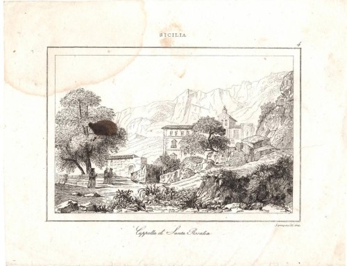 Stampa antica con veduta della cappella di Santa Rosalia presso Palermo.