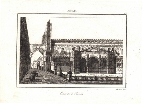 Stampa antica con veduta di Porta Nuova a Palermo.