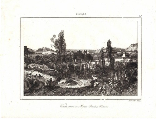 Stampa antica con veduta panoramica di Monreale presso Palermo.