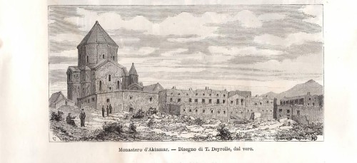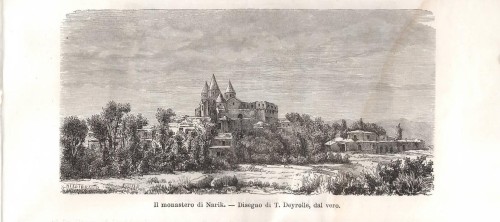Stampa antica con veduta del Monastero Armeno di Narek sul lago di Van, nella regione dell'Anatolia Orientale in Turchia. Il monastero è oggi completamente distrutto.