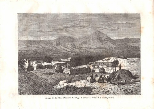 Stampa antica con veduta panoramica delle montagne del Kurdistan viste dal villaggio di Gharzen.