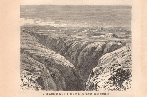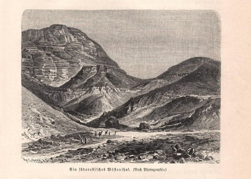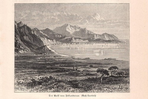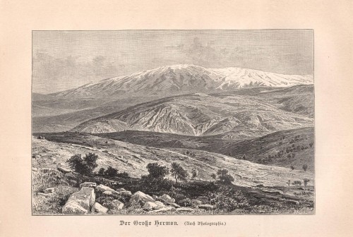 Stampa antica con veduta panoramica del Munku-Sardyk, montagna della Siberia meridionale al confine con la Mongolia, situata nella parte più alta della catena dei Monti Saiani Orientali (Bol'šoj Sajan). |