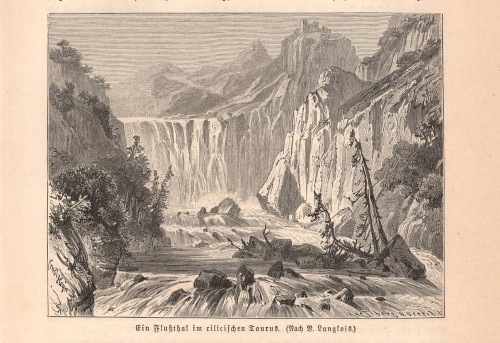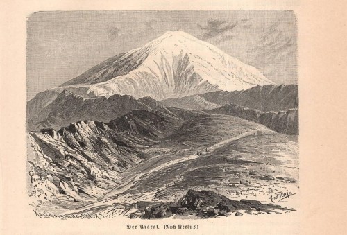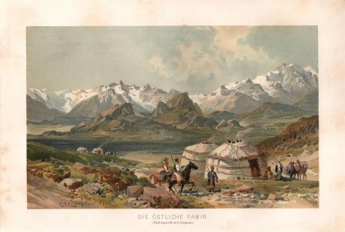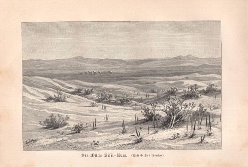 Stampa antica con veduta panoramica del deserto del Kizilkum (anche Kyzyl Kum e Qyzylqum) , che si estende tra Kazakistan, Turkmenistan e Uzbekistan, in Asia centrale. |
