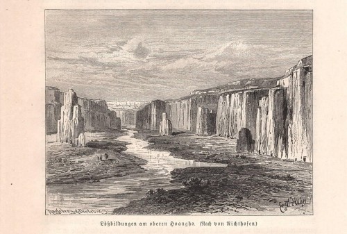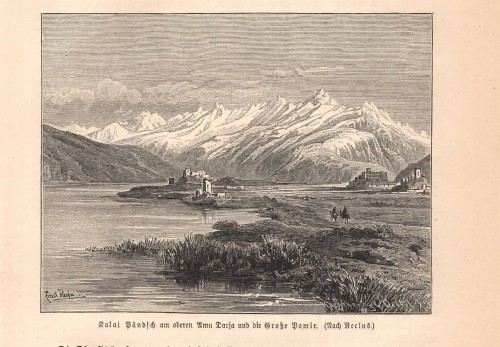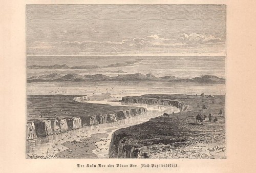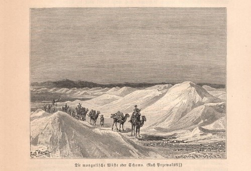 Stampa antica con veduta panoramica del Taklamakan (in uiguro Täklimakan qumluqi, in cinese takèlamagan shamò), deserto continentale dell'Asia centrale, situato quasi interamente nella regione autonoma uigura dello Xinjiang in Cina, che occupa quasi interamente il bacino del Tarim. |