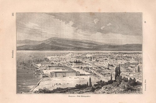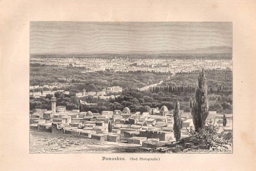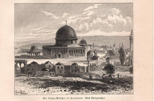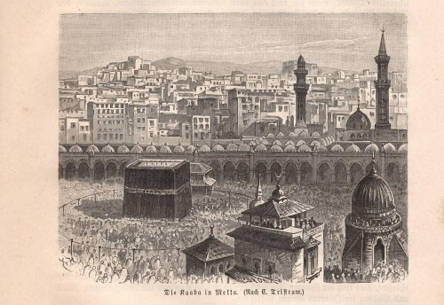 Stampa antica con veduta de La Mecca (Makka) con al centro la Ka'ba, l'edificio più sacro dell' Islam, durante un pellegrinaggio. |