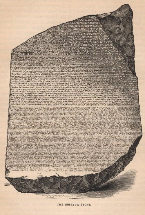Stampa antica con la Stele di Rosetta, stele egizia che riporta un'iscrizione divisa in tre registri, per quattro differenti grafie: geroglifici, cuneiforme, demotico e greco antico. Poiché si tratta del medesimo testo, la stele ha offerto, grazie alla parte in greco, una chiave decisiva per la comprensione della lingua egizia. Dal 1802 è conservata al British Museum di Londra. |