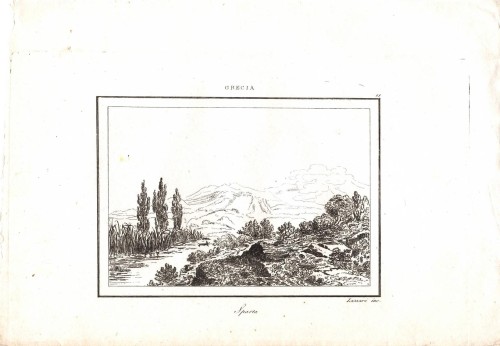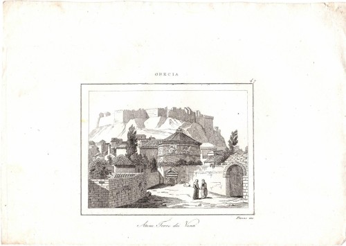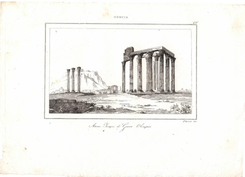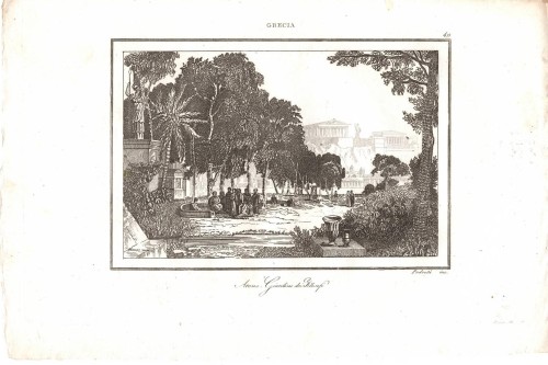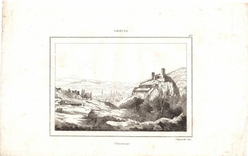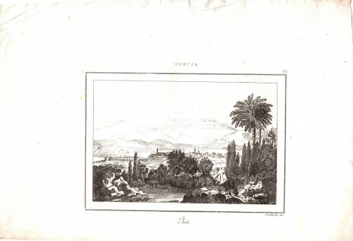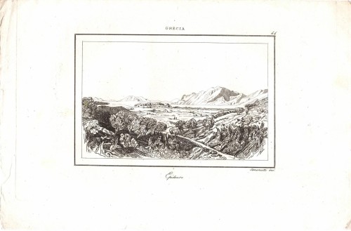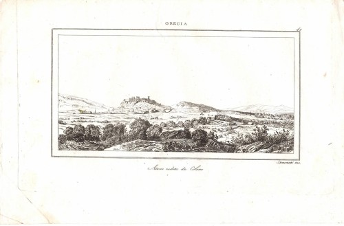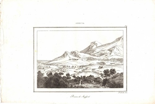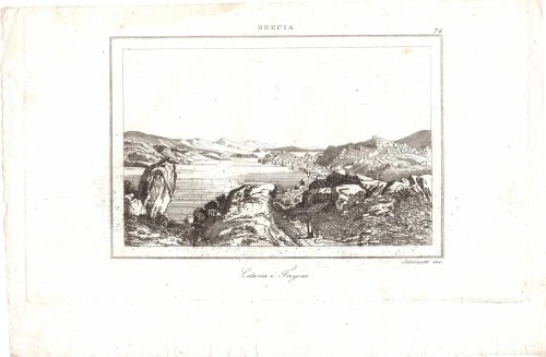 Stampa antica con veduta panoramica di Epidauro, piccola città (polis) dell'antica Grecia, sulla penisola dell'Argolide nel Golfo Saronico, conosciuta principalmente per il suo santuario dedicato ad Asclepio e per il suo teatro, ancora utilizzato al giorno d'oggi per rappresentazioni teatrali. |
