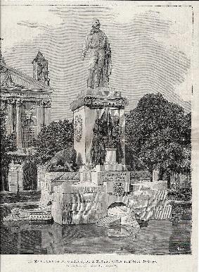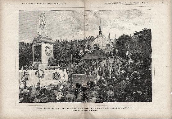 Stampa antica con veduta della piazza di Nizza (Nice), capoluogo del dipartimento delle Alpes-Maritimes nella regione della Provence-Alpes-Côte d'Azur, in occasione della cerimonia di inaugurazione del monumento a Giuseppe Garibaldi, con una grande folla assiepata intorno al palco delle autorità. |