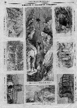 Stampa antica con un insieme di 8 vedute di grotte e caverne di diversi paesi del mondo: Emsambul in Egitto, Elefanta, Catacombe di Roma, Antiparos, Remonat, Fingal, Tourane, Grace-Dieu. |