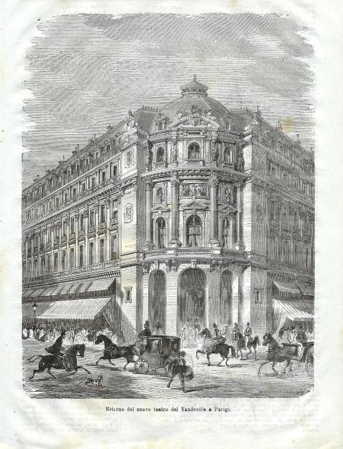 Stampa antica con veduta dell'esterno del Teatro del Vaudeville, a Parigi in Boulevard des Capucines, all'epoca appena inaugurato (nel 1869) ed oggi scomparso, trasformato dal 1927 nella sala cinematografica Gaumont-Opera. L'immagine è animata dalla presenza di numerose figure. |