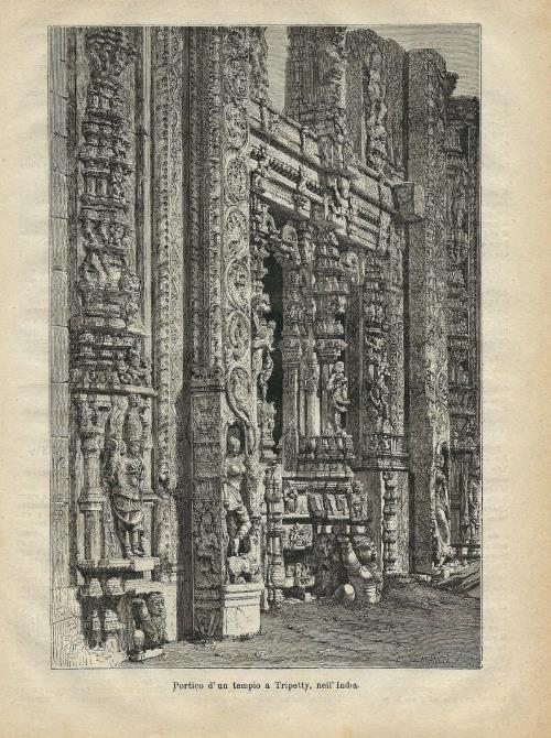 Stampa antica con un Gopura, o Gopuram, a Kumbakonam in India. E' una torre monumentale, solitamente ornata, posta all'entrata di ciascun tempio, specialmente in India meridionale. |