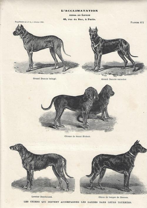 Stampa antica con cinque razze di cani da guardia: Grand Danois bringé, Grand Danois unicolor, Chiens de Saint-Hubert, Levrier Deerhound, Chien de berger de Beauce.