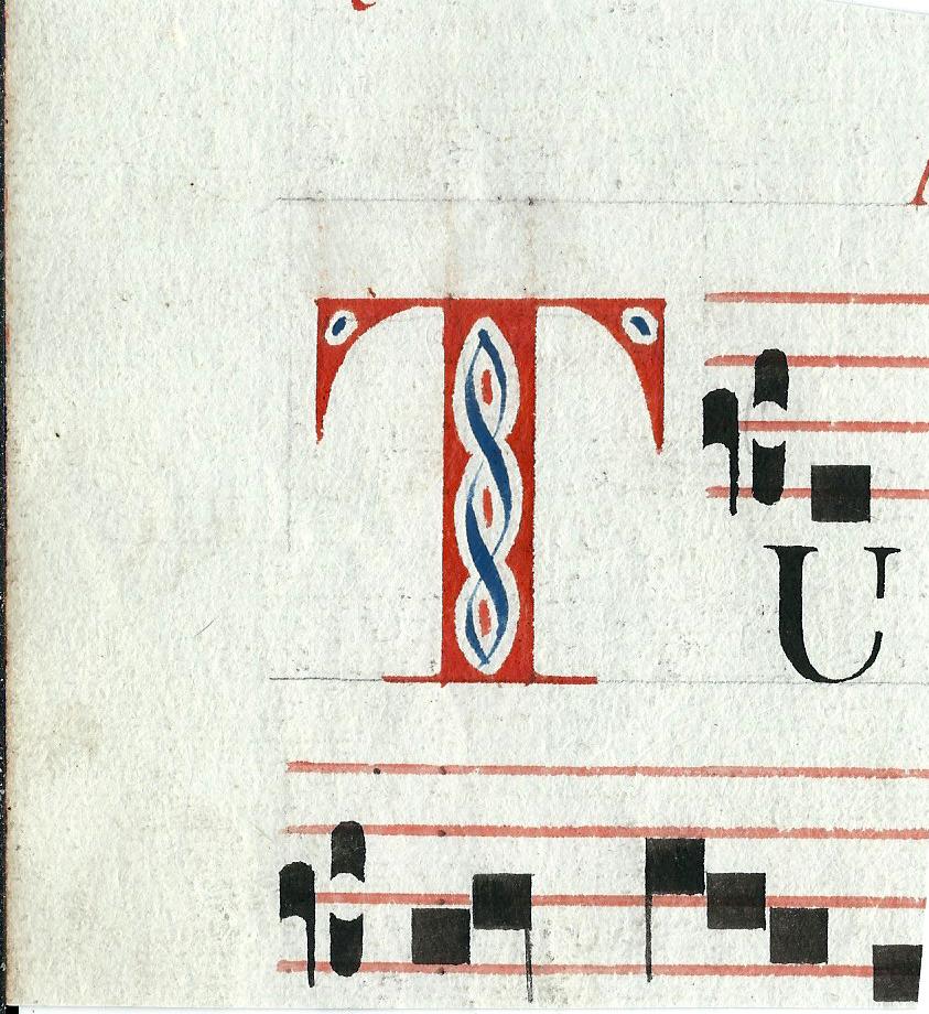 | Descrizione: Capolettera antico T manoscritto e miniato in rosso e blu e ritagliato da un antifonario di musica gregoriana del XIX secolo. | ||