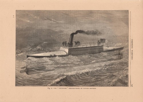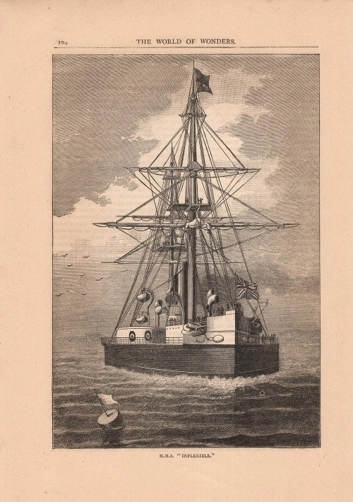 Stampa antica con la nave corazzata italiana a vela e vapore Venezia ancorata in porto, con alcune scialuppe che si stanno avvicinando. |