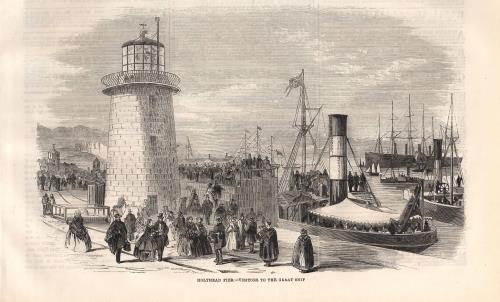 Bella stampa antica di grande formato con veduta panoramica della città e del porto di Holyhead, il centro principale della contea di Anglesey (Galles nord-occidentale) e dell'isola nota come Holyhead Island. Il piroscafo inglese Great Eastern, all'epoca la nave più grande del mondo, è all'ancora e l'immagine è presa dal frangiflutti. |