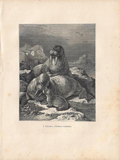 Stampa antica con numerosi esemplari di tricheco (oggi Odobenus rosmarus), con anche un piccolo. |