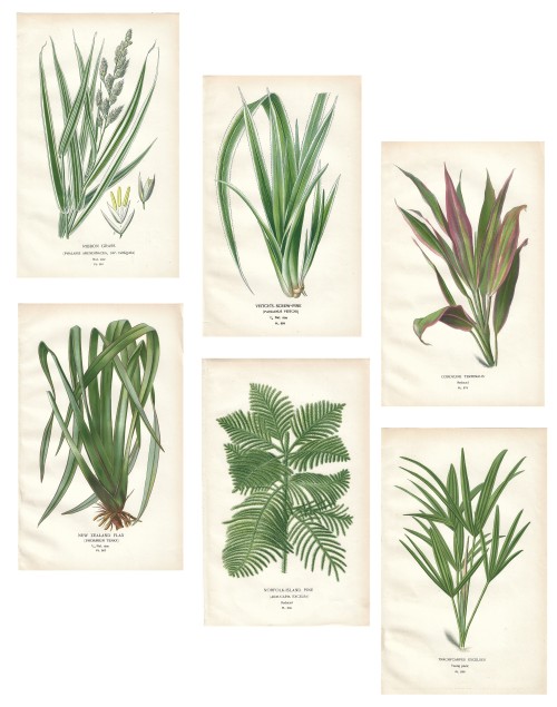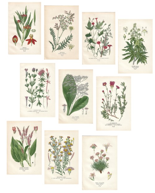 Bella serie di 10 stampe antiche inglesi di botanica con fiori: Asclepia curassivaca, Spiraea filipendula, Ipomaea coccinea e quamoclit, Fatsia japonica, Asperula orientalis e Phuopsis stylosa, Statice latifolia, Mesembryanthemum violaceum, echinatum, cymbifolium, Polygonum orientale, Aster versicolor e formosissimus, Armeria maritima. |