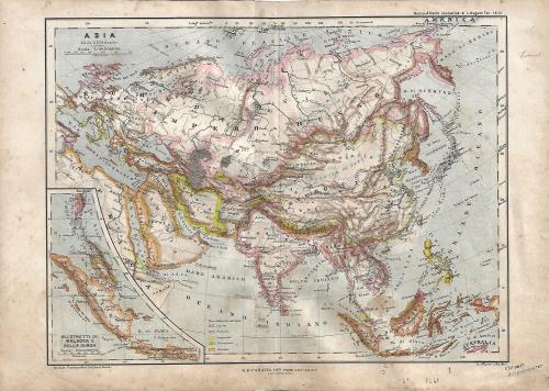 Piccola carta geografica antica dell' arcipelago della Malesia, con le isole Filippine, Borneo, Sumatra, Java, Celebes, le Molucche, Papua o Nuova Guinea, le isola Marianne. Una delicata coloritura evidenzia le colonie ed i territori indipendenti. |