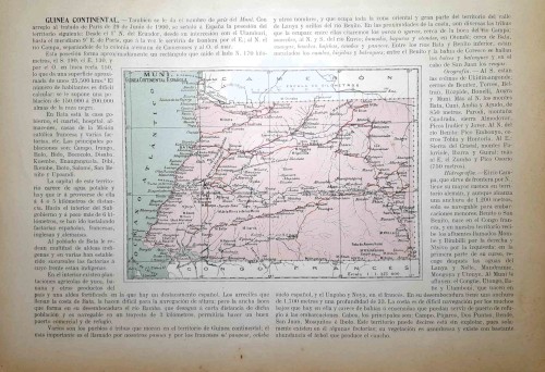 DESCRIPTION Carta geografica antica del Muni o Guinea Continentale Spagnola. La mappa è circondata da un lungo testo descrittivo in lingua spagnola.