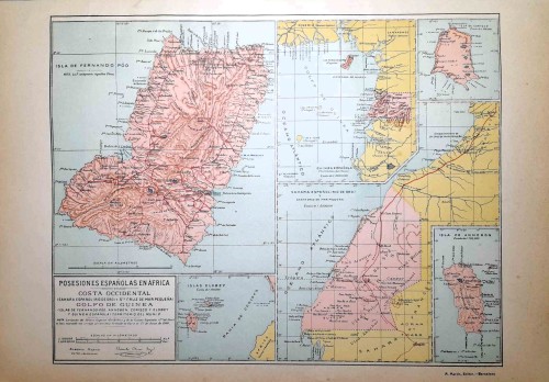 DESCRIPTION Carta geografica antica dei possedimenti della Spagna Africa sulla Costa Occidentale e nel Golfo di Guinea, Sahara Espanol, S.ta Cruz de Mar Pequena, Islas de Fernando Poo, Annobon, Corisco e Elobey, Guinea Espanola.