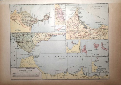 DESCRIPTION Carta geografica antica dei possedimenti della Spagna in nord Africa presso lo stretto di Gibilterra, Ceuta, Melilla, le Islas Chafarinas e le Islas Alhucemas.