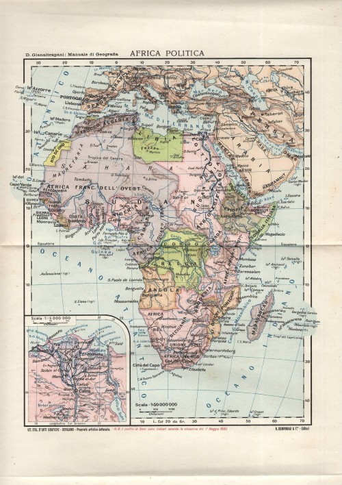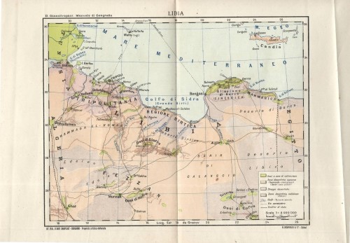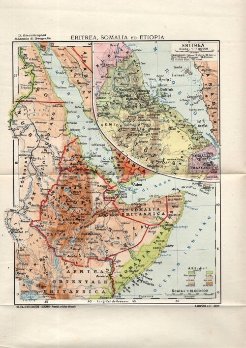Carta geografica antica di Eritrea, Somalia ed Etiopia. Eritrea e Somalia all'epoca sono colonie italiane, ma non ancora l'Etiopia, la cui conquista avverrà solamente alcuni anni più tardi. |