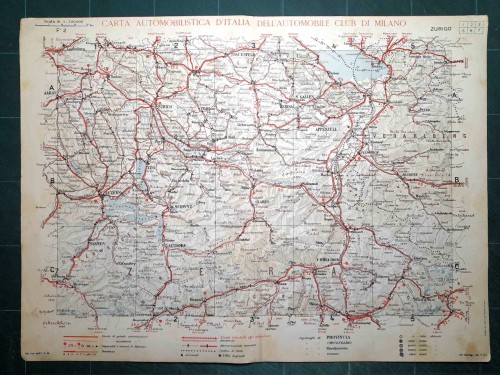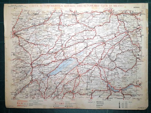 Carta geografica automobilistica antica di Berna e del territorio circostante, da Basel a nord fino a Interlaken a sud, da Besancon a ovest fino a Aarau a est, con al centro il lago di Neuchatel. Le strade principali dell'epoca sono evidenziate in rosso. |