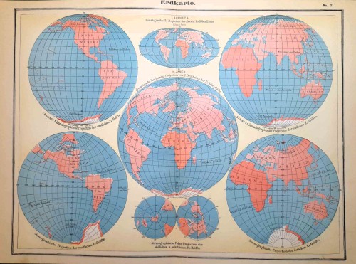 DESCRIPTION Carta geografica antica con il mappamondo disegnato con diverse proiezioni e prospettive.