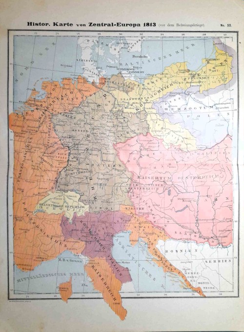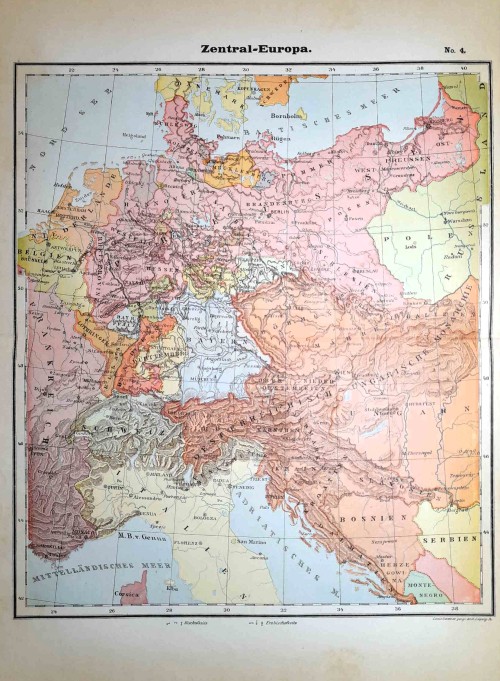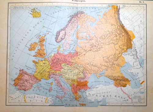 Carta geografica antica dell' Europa antecedente la prima guerra mondiale, con i grandi imperi di Germania, Austria-Ungheria e Ottomano che occupano gran parte del territorio europeo. Il Trentino, l'Alto Adige e l'Istria appartengono all' Austria. |