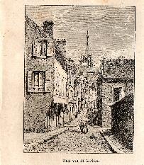 Stampa antica con veduta panoramica a volo d'uccello di Versailles, città delle Francia nel dipartimento di Yvelines nella Île-de-France. |