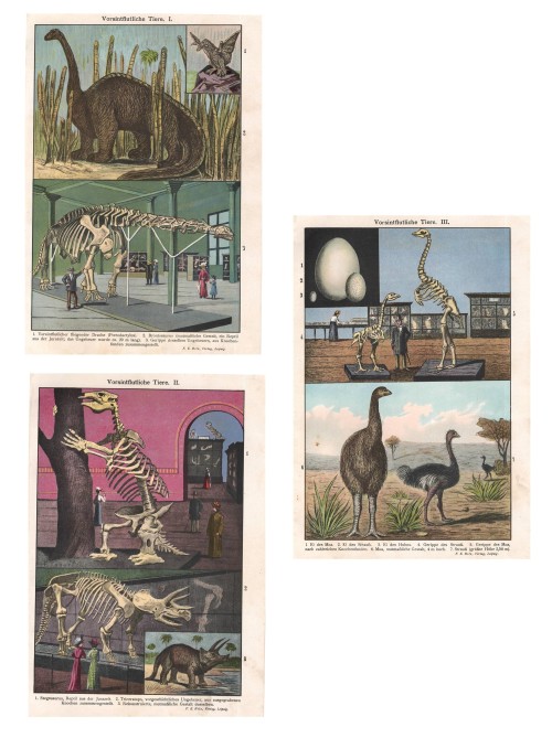 Bella e rara serie di 3 stampe antiche con scheletri e ricostruzioni di dinosauri, Pterodactilo, Brontosauro, Stegosauro, Triceratopo ed altri animali preistorici.