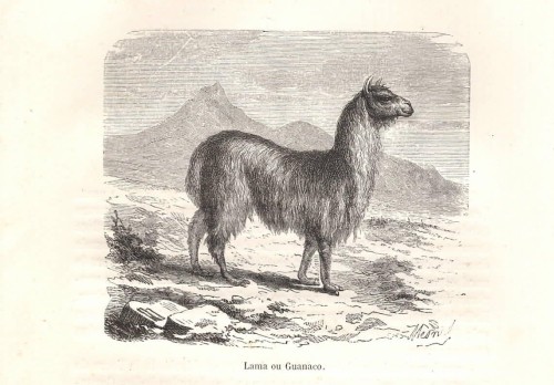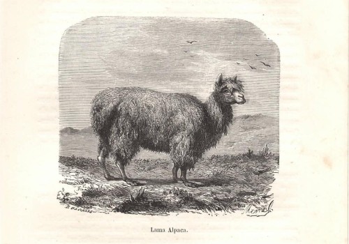 Bella stampa antica con un paesaggio agreste con una contadina ed il suo bambino seduti presso la riva di un fiume attorniati dai loro animali: mucche, cavalli, asini. |