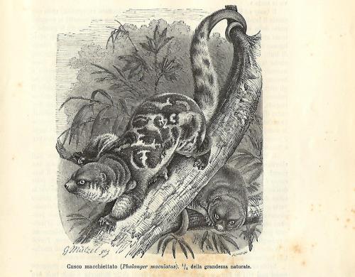 Stampa antica con due esemplari di Tricosuro volpino (Trichosurus vulpecula).