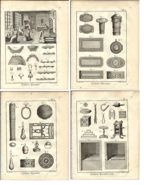 Bella serie completa di quattro stampe antiche settecentesche tratte dalla Encyclopedie dedicate alla produzione di oreficeria ed argenteria "galante". Nella prima tavola vi è l'interno di un laboratorio con diversi operai all'opera e la proprietaria al banco di vendita con un cliente, nelle altre tavole numerosi esempi di oggetti in oro ed argento, monili, scatoline, tabacchiere, pomi di bastoni da passeggio, oltre ad attrezzi, utensili e macchinari per la lavorazione dei metalli preziosi. |